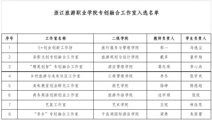 根据学校《关于开展浙江旅游职业学院专创融合工作室申报工作的通知》要求,经各二级学院推荐申报,徐霞客创新创业学院组织校外专家进行评审,现将学校首批专创融合工作室申报结果公示如下: